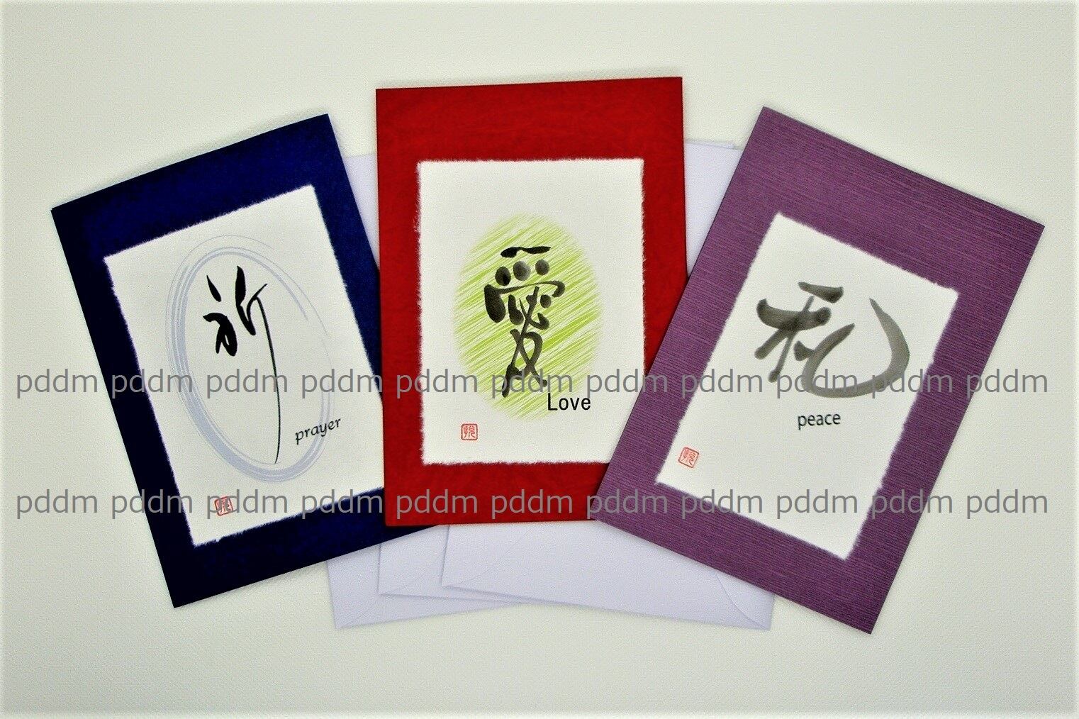 祈・愛・和の3種類の文字が、和紙の紙の上に書かれています。