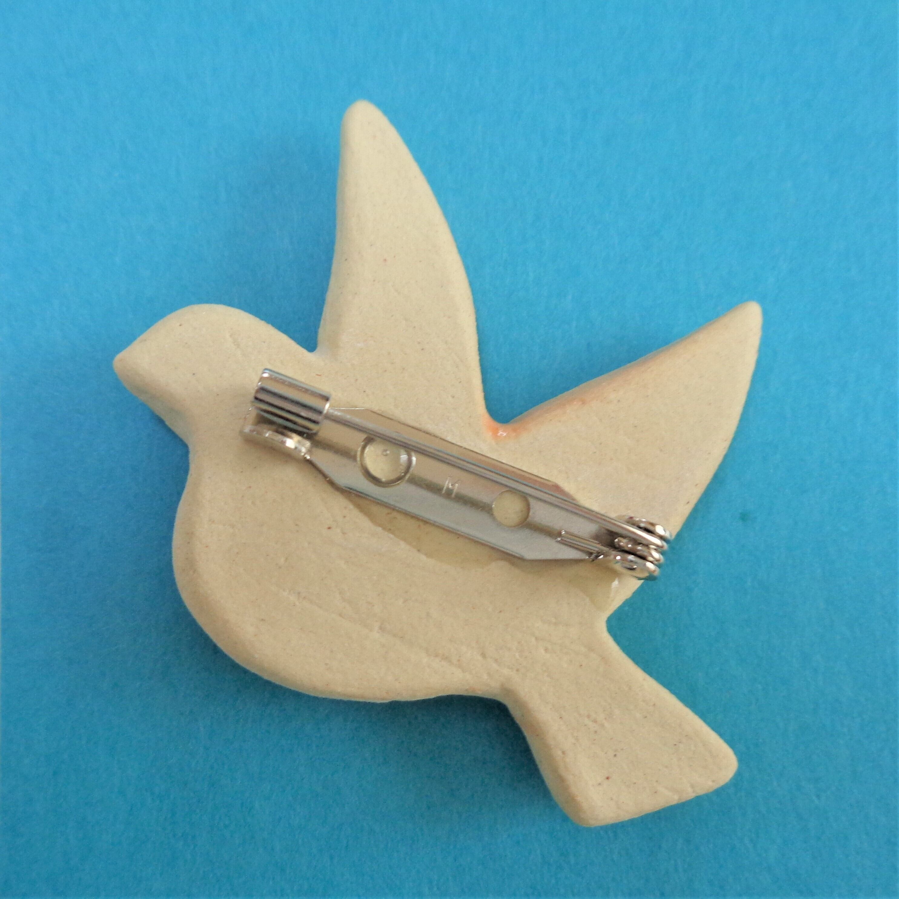本焼きで作成されたブローチです。鳩は聖霊を意味したり、平和のシンボルでもあります。世界の、お互いの平和を望んで、つけてみるのも素敵です。すべての人に、神の平和と慈しみが届きますように。堅信のお祝いにも、ご利用ください。焼き物の温かみのある味がでています。