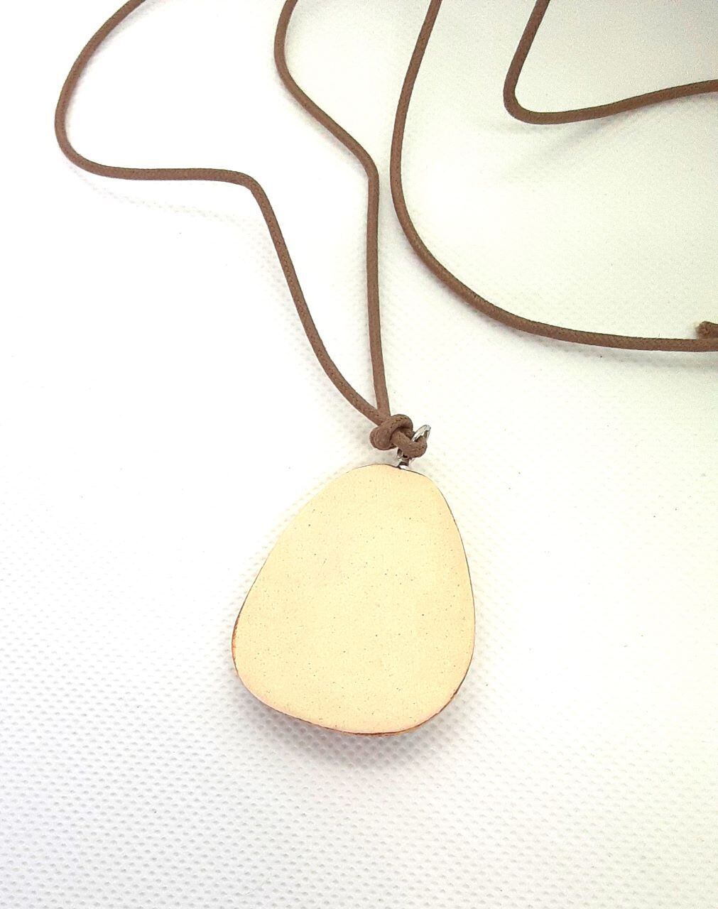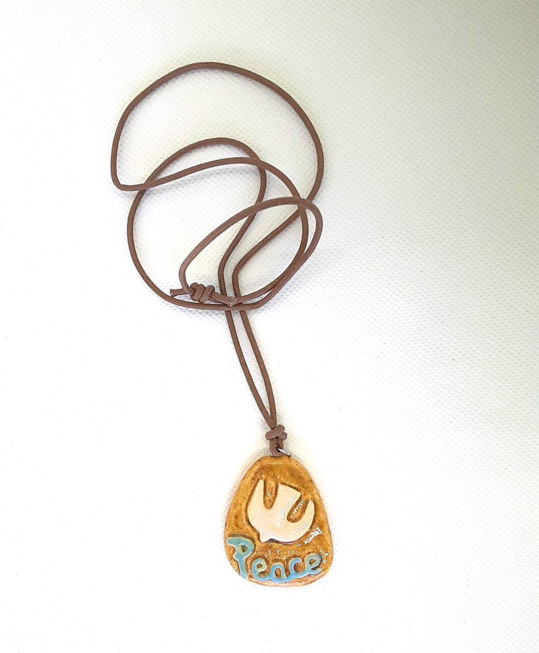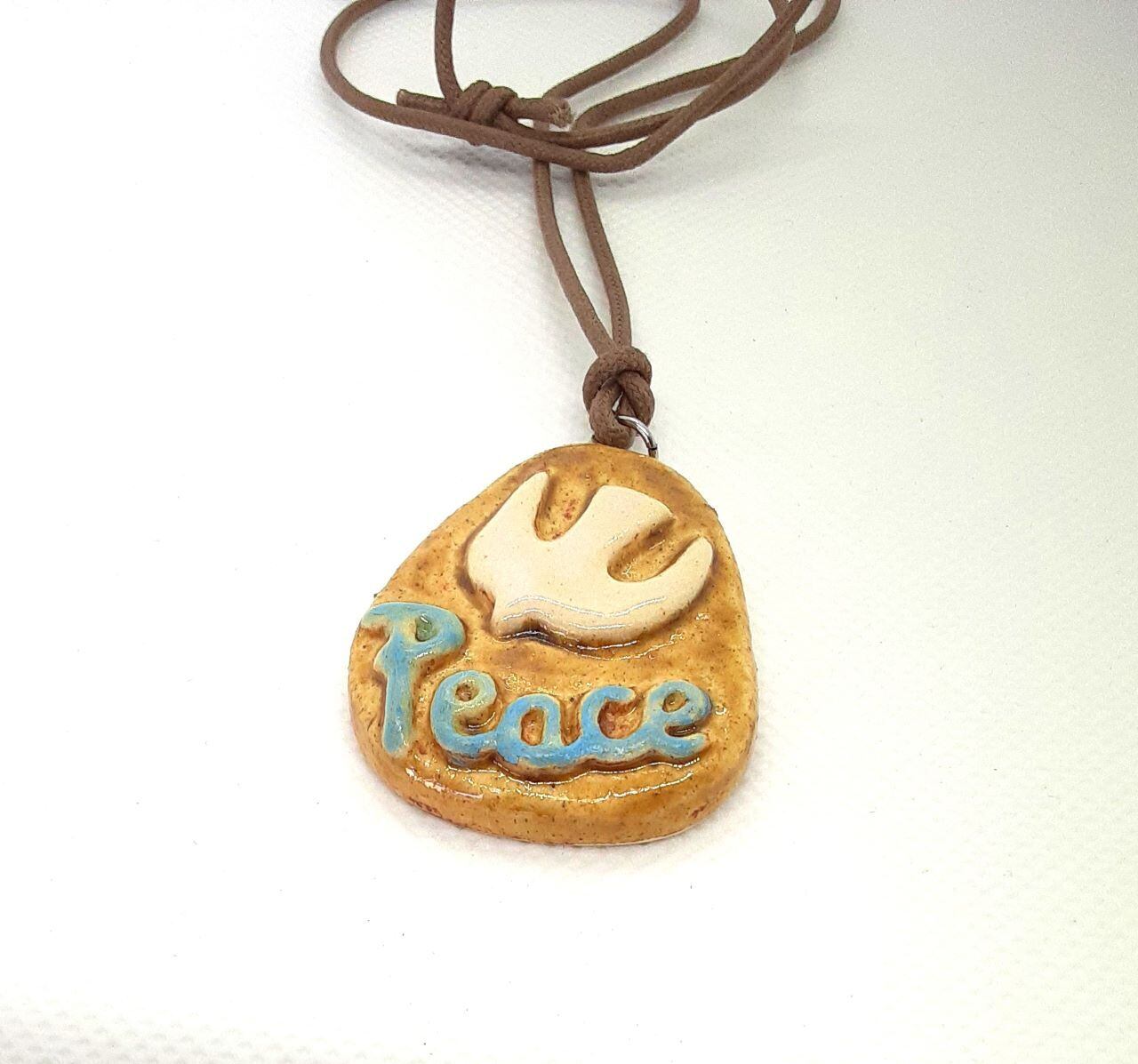 シスター手作りの焼き物ペンダントです。Peaceという言葉が書かれ、聖霊を意味する鳩の絵柄が描かれています。一つ一つ焼き具合が違うという、焼き物の味が出ています。セーターの上などにペンダントとして、下げてみてはいかがでしょうか。堅信のプレゼントとしても、ご利用できます。